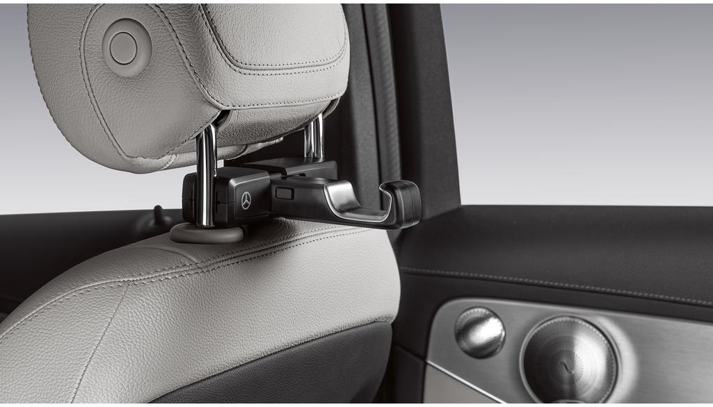 Die Kopfstützenelemente können einfach angeschlossen und entfernt werden. Das modulare System basiert auf einem Basisträger, dieser kann durch verschiedene Produkte – Kleiderbügel, Taschenhaken oder Klapptisch – erweitert werden. Der Basisträger (A0008103300) ist ein für die Montage zwingend benötigtes Zusatzteil!
