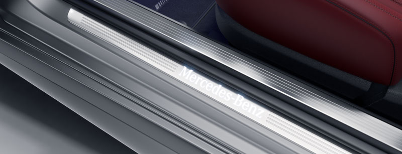 Ein optischer Blickfang, der zur besseren Orientierung bei Dunkelheit dient: das schwarze Wechselcover mit weißem AMG Schriftzug für die Einstiegsleiste mit LED-Beleuchtung. Das Wechselcover aus glänzendem Edelstahl überzeugt nicht nur durch eine einfache Montage und eine exakte Passform, sondern zudem durch Strapazierfähigkeit und Langlebigkeit.
